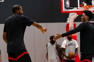 火箭官方晒今日训练照:KD阿门击掌庆祝 奥科吉秀霸王举鼎暴扣