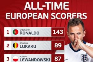 欧洲国家队历史射手榜:凯恩76球进前5名,卢卡库莱万排二三