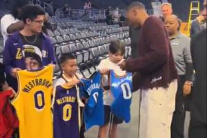 威少给小球迷的球衣签名 签了雷霆和火箭的唯独略过了湖人的