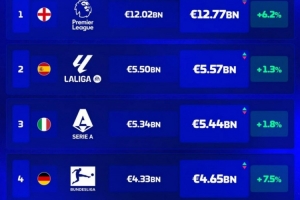 五大联赛球队总身价榜:英超遥遥领先,西甲次席,意甲第三