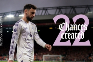 B费本赛季为曼联出战8场英超比赛,打进2球,助攻1次。曼联官方社媒晒出数据海报,确认B费本赛季联赛创造22次机会,英超球员中最多。