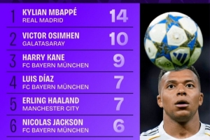 本赛季欧冠射正榜:姆巴佩14次第一,奥斯梅恩10次第二凯恩第三