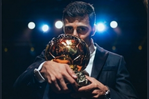 曼城官推晒罗德里亲吻金球奖照片:去年今日,罗德里获得金球奖