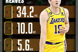 34.2+10+5.6!贝弗利转发前队友里夫斯场均数据图: