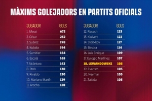巴萨队史射手榜:梅西672球居首 莱万追平内马尔位列第18