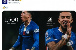 切尔西达成1500场顶级联赛胜利里程碑,其中对热刺68胜为最多