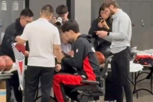 期待开拓者媒体日!杨瀚森早早到场馆为篮球与球衣签名