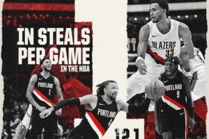 五小阵容!开拓者晒数据海报:场均12.1次抢断!联盟第一!