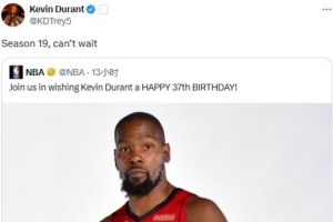 杜兰特转发官方生日祝福推文:迫不及待开启生涯第19赛季了
