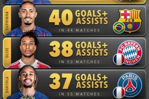 2025年边锋参与进球榜:亚马尔44球居首,拉菲尼亚40球次席
