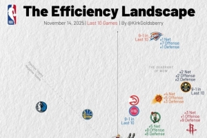 近10战火箭进攻效率第1/雷霆防守效率第1/掘金均第2 湖勇船皆攻弱