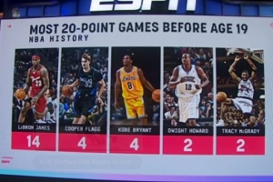 弗拉格19岁前砍下4场20+与科比并列历史第二 詹姆斯14次第一
