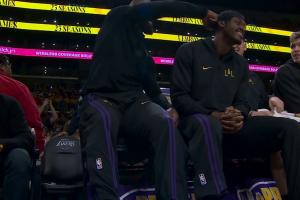 0分1助!詹姆斯打了五分半下场休息 与范德彪嬉戏打闹