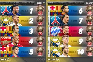 体育资讯09月25日讯 外媒Score 90排无金球球员TOP10,内马尔居首,姆巴佩第二,伊涅斯塔第三。