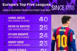 体育资讯11月19日讯 Squawka统计了2017-2018赛季以来球员在五大联赛禁区外远射的进球数量,并列出榜单,梅西40球居首,德布劳内25球次席。