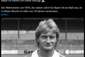 在官方公告中,勒沃库森声明:“俱乐部对迪特·赫尔佐格的逝世表示哀悼! 🙏他曾效力于勒沃库森7年,这位1974年世界杯冠军队成员于本周去世,享年79岁。”