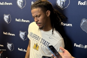 体育资讯10月2日讯 莫兰特在训练营特地穿上了母校莫瑞州立大学的T恤。在采访的时候,莫兰特表示自己每天都会穿莫瑞州立大学的装备。