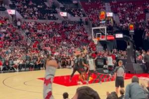 开拓者队内表演赛:杨瀚森挨了克林根一肘倒地 举着双手缓缓起身