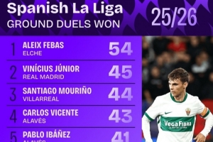 体育资讯10月7日讯 日前,Squawka统计了本赛季西甲地面拼抢成功次数排行,维尼修斯45次第二,姆巴佩40次第七。