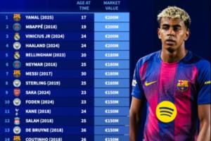 体育资讯10月29日讯德转盘点了历史上身价最高的30名球员,历史上共有四名球员达到过2亿欧元里程碑,分别是亚马尔(2025年,17岁)、姆巴佩(2018年,19岁)、维尼修斯(2024年,24岁)和哈兰