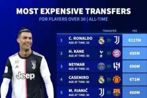 体育资讯10月29日讯德转盘点了足坛历史30岁及以上球员转会费纪录榜,其中C罗33岁加盟尤文以1.17亿欧居首,凯恩加盟拜仁次席,内马尔9000万欧第三。30岁以上球员转会费榜:1、C罗33岁(皇马→尤