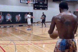 东契奇投篮热身调戏训练师:来防我呀!然后调高弧度命中三分