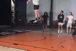 哥们人形火箭啊!轻轻一跳俯瞰篮筐了