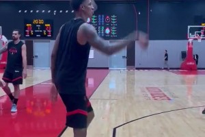 东契奇投篮热身调戏训练师:来防我呀!然后调高弧度命中三分