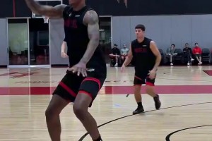 东契奇投篮热身调戏训练师:来防我呀!然后调高弧度命中三分