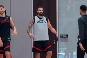 东契奇投篮热身调戏训练师:来防我呀!然后调高弧度命中三分
