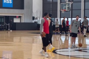 东契奇投篮热身调戏训练师:来防我呀!然后调高弧度命中三分