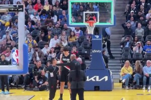 依旧很礼貌!杨瀚森撞倒勇士理查德犯规,很友好地将对手拉起来!
