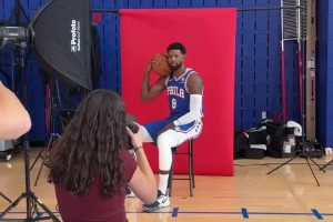 新赛季能回暖吗乔治出席76人媒体日,拿球怒吼摆造型~