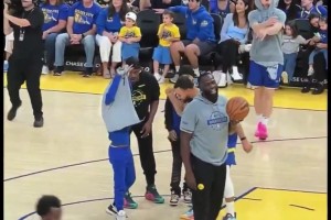 金州拉文!库里赛前热身秀了一记扣篮,引得现场球迷欢呼