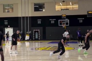 东契奇投篮热身调戏训练师:来防我呀!然后调高弧度命中三分