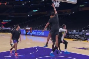 东契奇投篮热身调戏训练师:来防我呀!然后调高弧度命中三分
