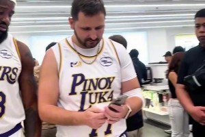 东契奇投篮热身调戏训练师:来防我呀!然后调高弧度命中三分