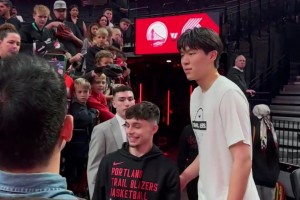 很受大家喜爱啊杨瀚森赛前为热情的开拓者球迷合影、签名~~
