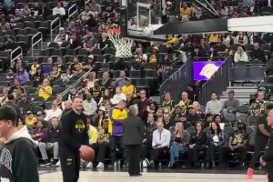 东契奇投篮热身调戏训练师:来防我呀!然后调高弧度命中三分