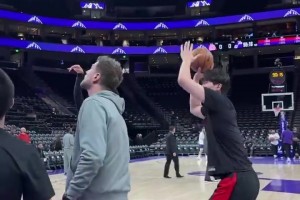 期待今天发挥!在斯普利特指导下,杨瀚森赛前热身猛练小抛投
