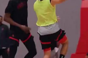 东契奇投篮热身调戏训练师:来防我呀!然后调高弧度命中三分