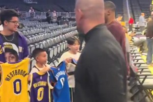 啊这!威少给小球迷签了雷霆和火箭球衣,略过了湖人球衣