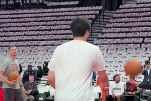 来自马刺冠军中锋的指导!杨瀚森赛前训练,斯普利特特地上前指点