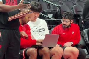 在聊什么?杨瀚森赛前与助教人员积极沟通,无需翻译!