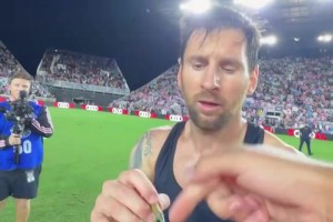 梦想成真!梅西在摄影师镜头上签名!这个镜头有点帅啊!