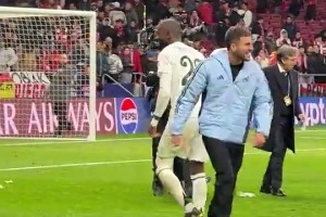 此前吕迪格向马竞球迷做斗牛士动作,马竞球迷回击矿泉水瓶