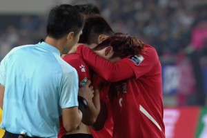遗憾!南通队球员李贤成失点丢冠后痛哭,主裁马宁上前安慰