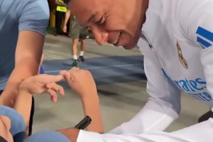 皇马球员为阿拉木图小球迷签名,原来姆总一直用左手写字