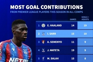 体育资讯11月7日讯德国转会市场统计了英超球员本赛季各赛事的参与进球数量,并列出榜单,哈兰德参与19球居首,萨尔参与10球次席。本赛季英超球员参与进球排名(所有赛事)哈兰德(曼城)——14场19球伊斯梅