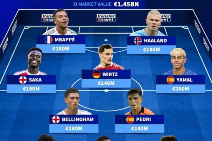 体育资讯10月16日讯德转盘点了欧足联球员的最高身价阵容,整套阵容总价值高达14.5亿欧元。其中巴萨小将亚马尔以2亿欧元成为身价最高的球员,姆巴佩、哈兰德和贝林厄姆均以1.8亿欧元并列第二。欧足联最贵阵